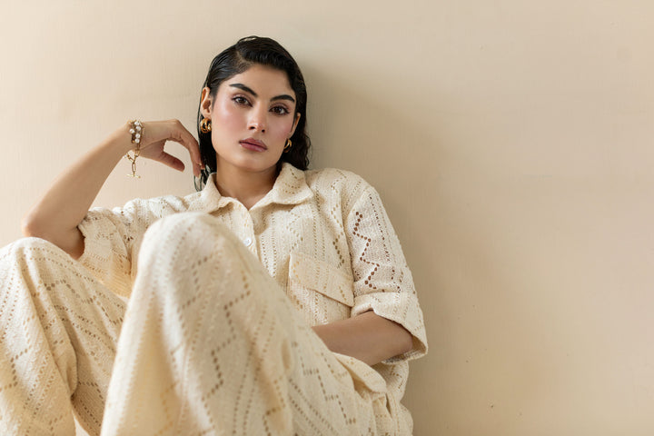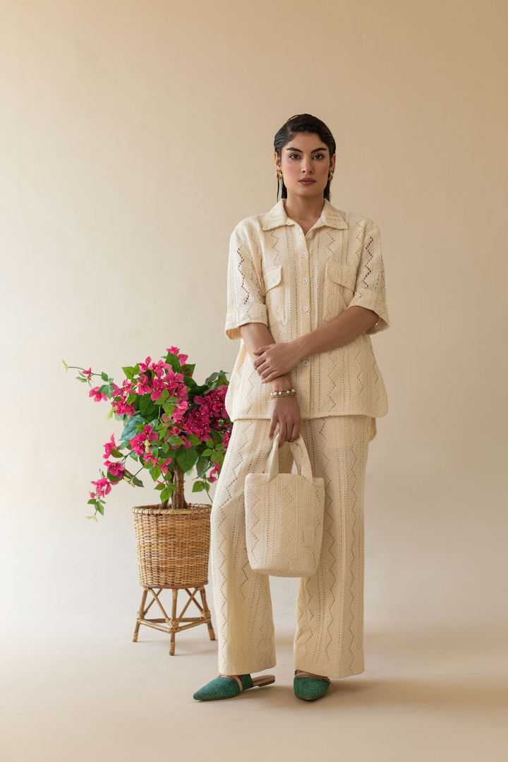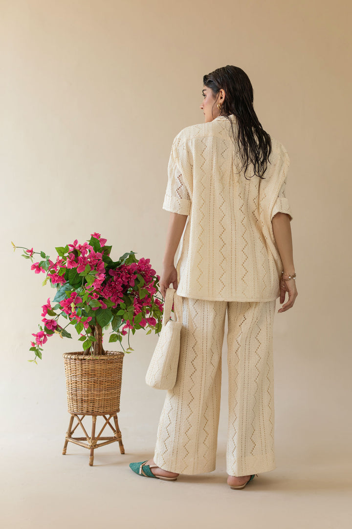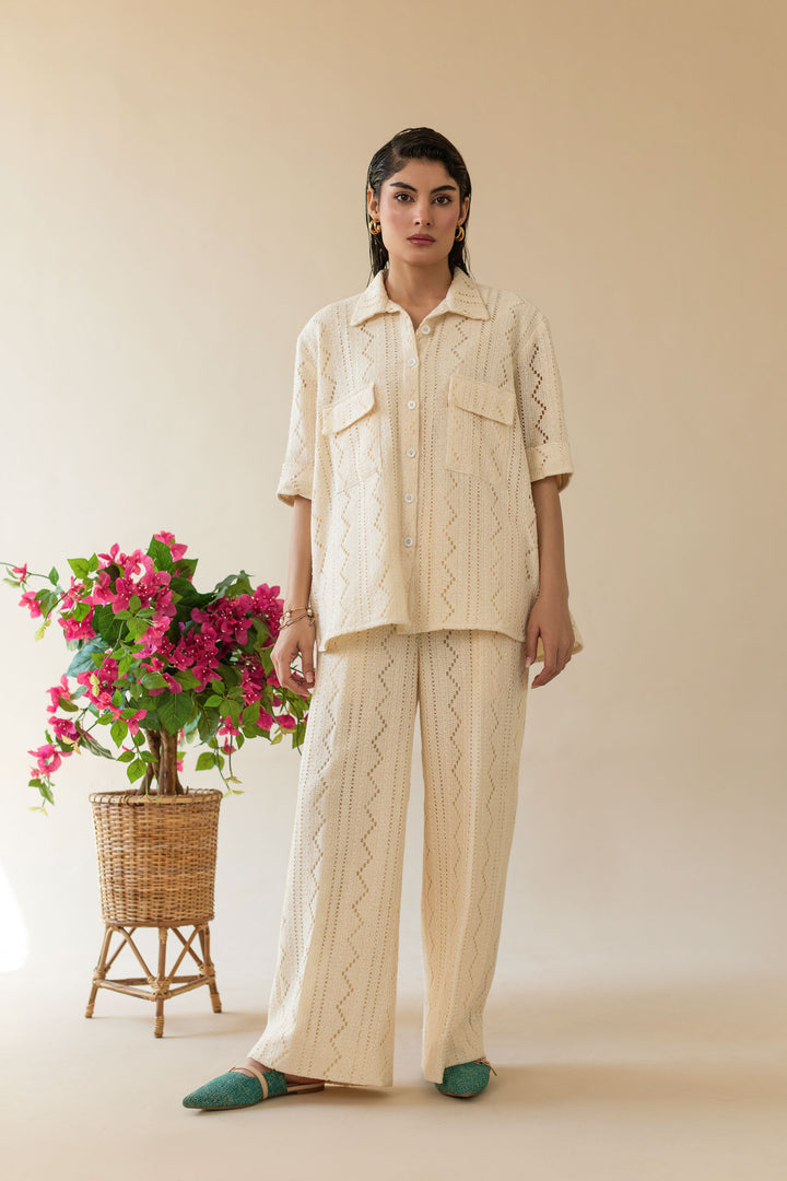 Matching wide-leg trousers in the same intricate croché, lined with white muslin