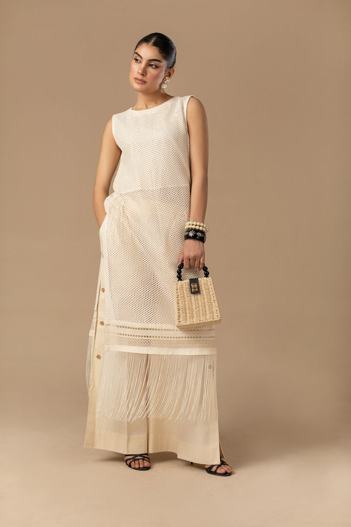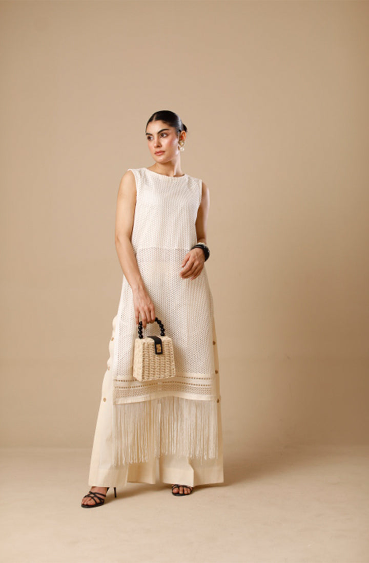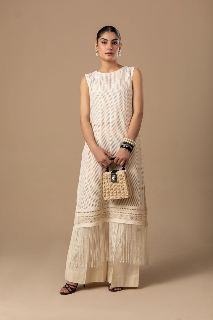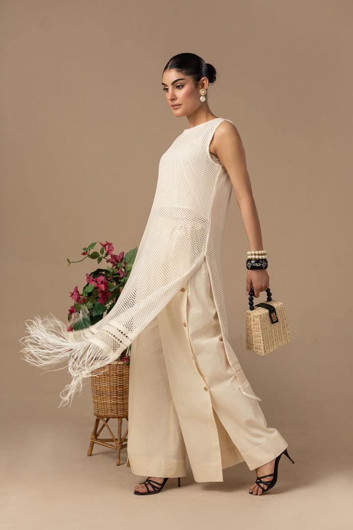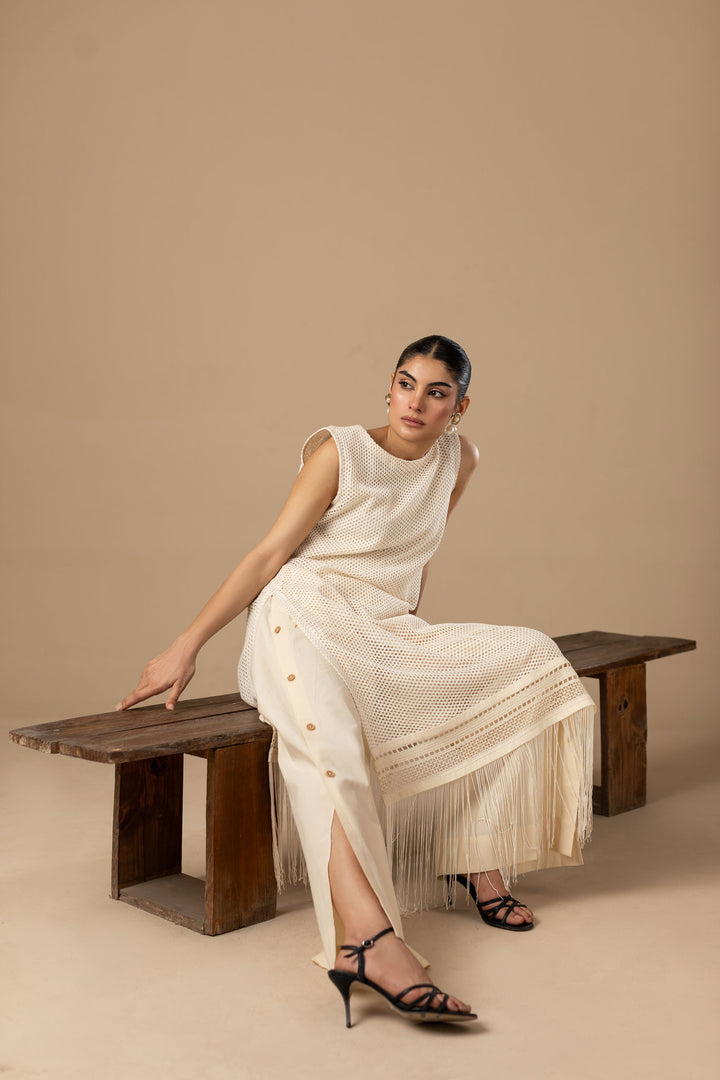 Top: A sleeveless long shirt in soft ivory croché fabric, designed with rich texture and finished with elegant fringe detailing at the hem. A timeless piece that combines sophistication with effortless grace.