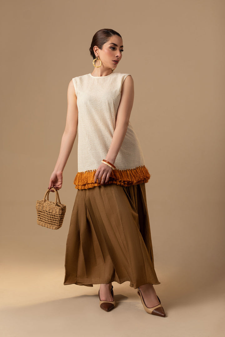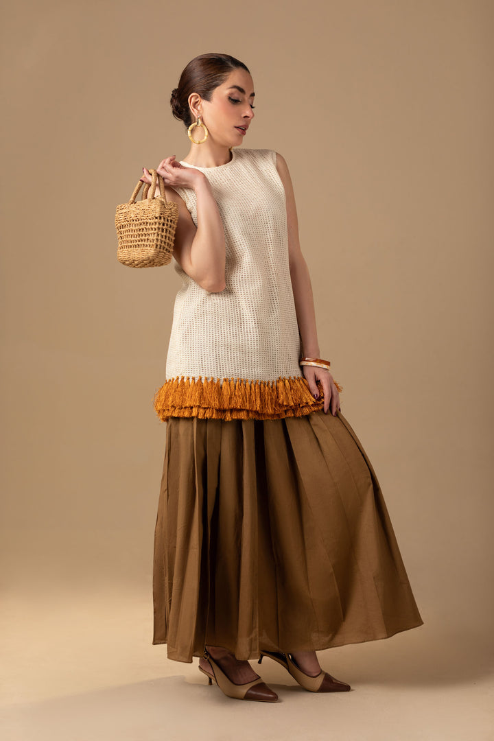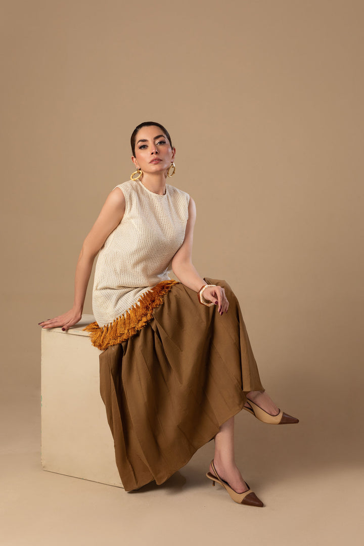 The look is grounded with a statement camel-colored pleated skirt, designed