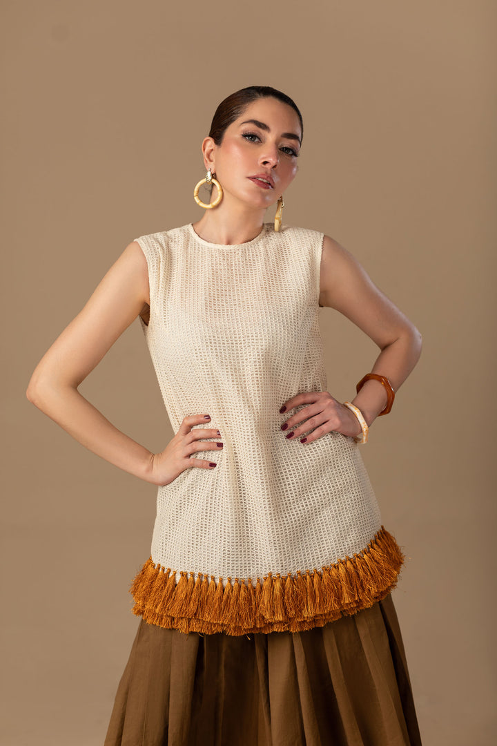 tassels in a rich amber tone, beautifully tracing the hem for a touch of whimsy